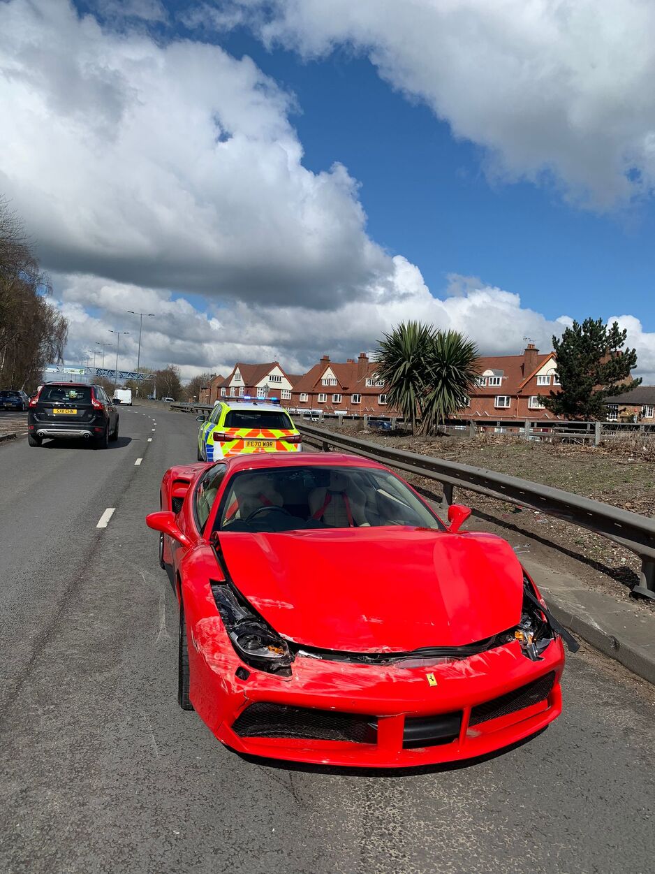 Policija u je saopćila da povrijeđenih u nesreći nije bilo, ali su ego i novčanik vlasnika sigurno pretrpjeli udarac. Ferrari 488 GTB je proizveden 2017. godine i kupljen je u Derbyju u Engleskoj, a vlasnik je nakon samo tri kilometra doživio nesreću i oštetio svoj automobil.