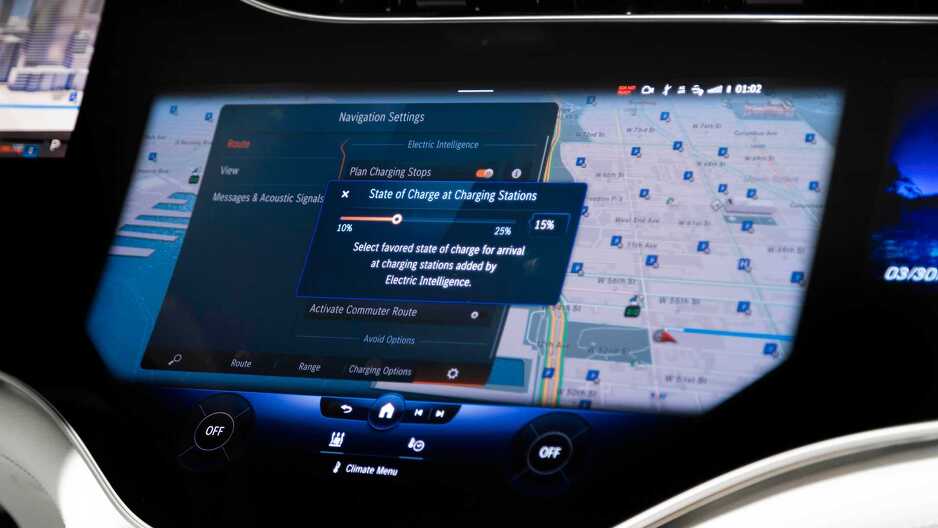 Navigacija sa funkcijom Električne Inteligencije planira najbržu i najprikladniju rutu, uključujući zaustavljanje zbog punjenja, na osnovu brojnih faktora i, na primjer, dinamički reaguje na gužve u saobraćaju ili promjenu stila vožnje. Novina u modelu EQS je vizualizacija u infotainment sistemu (MBUX Mercedes-Benz User Experience) koja pokazuje da li je raspoloživi kapacitet baterije dovoljan za povratak na početnu tačku bez punjenja. Stanice za punjenje duž rute, koje su ručno dodate, imaju prednost pri proračunu rute. Predložene stanice za punjenje mogu biti izuzete. Moguća je i kalkulacija očekivanih troškova punjenja.
