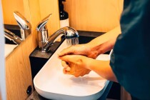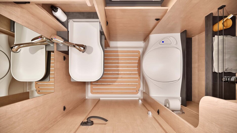 Kupatilo je također potpuno redizajnirano. Neposredno pored stepenica nalazi se prostrani tuš sa sklopivim umivaonikom i WC šoljom. Tu su i brojne police i uklonjiva vreća za veš - praktični detalji koji se obično nalaze u većim modelima.
