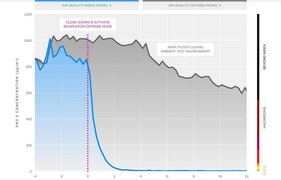 Za vrijeme sprovođenja testa koji je obavljen u balonu u automobilu se pojavio gotovo jednak broj opasnih čestica. Ipak, kroz dvije minute, količina zagađenja u Modelu X je počela da opada do mjere gdje nivo zagađenja uopće nije mogao biti detektovan jer naprosto nije postojalo.