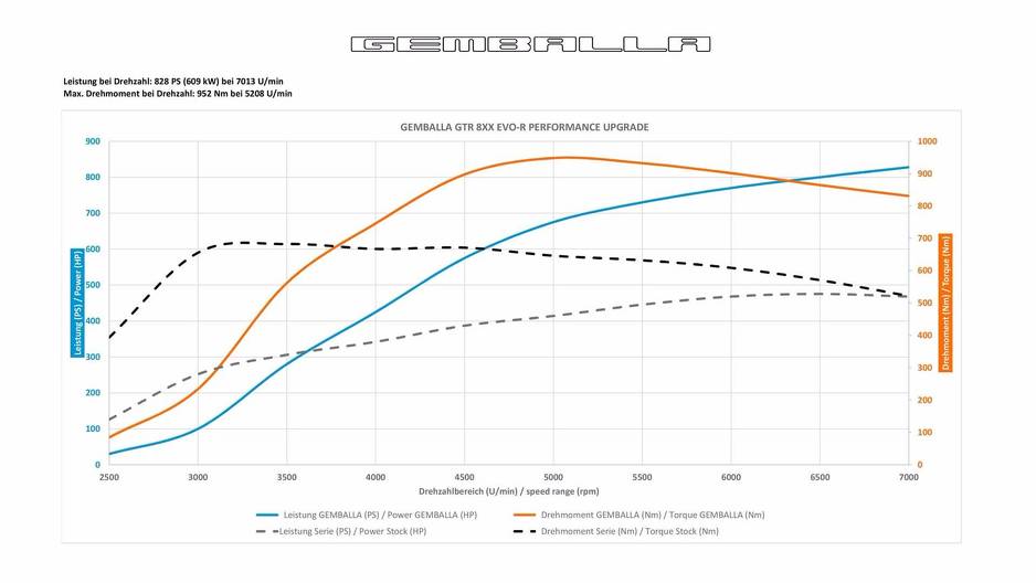 S dodatnih 248 konjskih snaga GTR 8XX Evo-R BiTurbo od 0 do 100 km/h stiže nakon 2,38 sekundi. Od 0 do 200 km/h potrebno mu je 7,5 sekundi, a od 0 do 300 km/h stići će nakon 18,8 sekundi. Za međuubrzanje od 100 do 200 km/h potrebno mu je samo 4,5 sekundi.