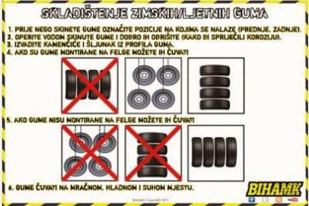 Kada je riječ o skladištenju guma, prije skidanja ih treba označiti prema pozicijama (prednje, zadnje), potom ih skinuti i oprati te dobro obrisati, kako bi se spriječila korozija. Također, preporučuje se vađenje zaglavljenih kamenčića i šljunka iz profila guma.
