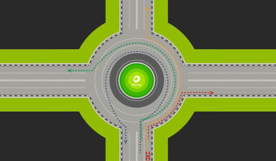 U primjeru navedenom na BIHAMK-ovoj skici kružnog toka postoje dvije saobraćajne trake. Ako se želite isključiti prvom ulicom (1), izaberite desnu saobraćajnu traku, zelenu putanju. Ako planirate voziti ravno u drugu ulicu (2), vozite crvenom putanjom. U slučaju isključenja u treću ulicu (3), trebate se kretati unutrašnjom, odnosno plavom putanjom. Preporučuje se da se prestrojavanja izvedu pravovremeno i na označenim lokacijama na skici. Međutim, ako se vozilom želite vratiti u istu ulicu (4) korištenjem kružnog toka, onda se krećite unutrašnjom, odnosno narandžastom putanjom. Isprekidane putanje na skici se koriste u slučaju pojačanog saobraćaja u kružnom toku.