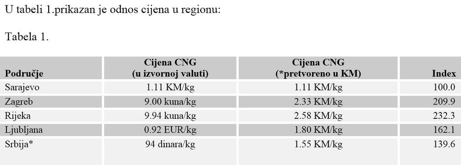 Također, ukoliko posmatramo cijene CNG-a u zemljama regiona, evidentno je da je cijena CNG-a koju nudi KJKP Sarajevogas trenutno najpovoljnija. U poređenju sa nekim državama, čak i za 50 % niža što bi svakako trebao biti dodatni stimulans za masovniju upotrebu ovog ekološki prihvatljivog energenta.
