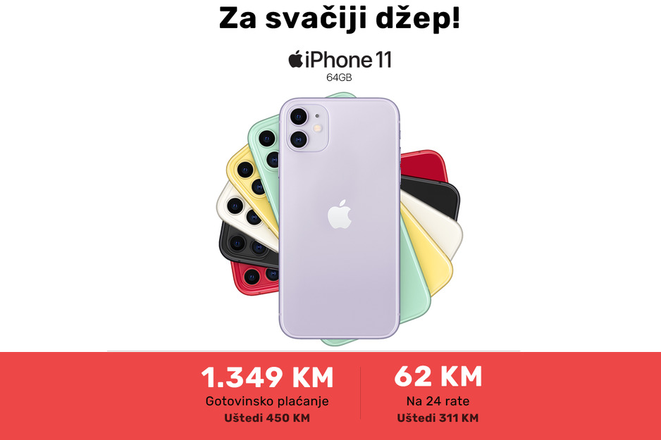 Sada je idealno vrijeme za kupovinu iPhonea 11. Cijena je za svačiji džep. iPhone 11 kupite za 1.349 KM i možete uštedjeti 450 KM. Dobijate dvije godine garancije, besplatnu dostavu širom BiH, migraciju podataka i savršeno iskustvo kupovine. Preporuka za svaki iPhone je Apple 20W USB-C power adapter, zaštitno staklo i kvalitetna futrola. Uz svaki iPhone na promo ponudi možete iskorisiti popust na Apple EarPods slušalice. Cijena sada iznosi 69 KM.