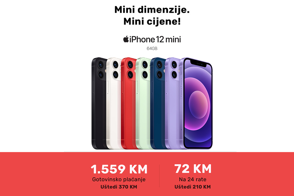 "Pripremili smo i mini cijenu za iPhone mini dimezija. iPhone 12 mini sada košta 1.559 KM i možete iskoristiti uštedu od 370 KM. Garancija traje dvije godine. Posjetite nas u Alta Shopping centru u Sarajevu i Delta Shopping centru u Banjoj Luci", dodali su iz AT Storea.