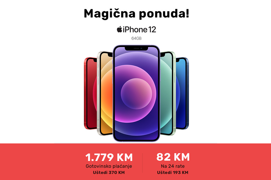 Još jedna magična ponuda koju preporučujemo, ako želite uštedjeti 370 KM. iPhone 12 sada košta 1.779 KM. Iskoristite i mogućnost plaćanja na rate kreditnim karticama. Plaćanje na rate može izvršiti i online i za 24h možete očekivati dostavu na adresu.