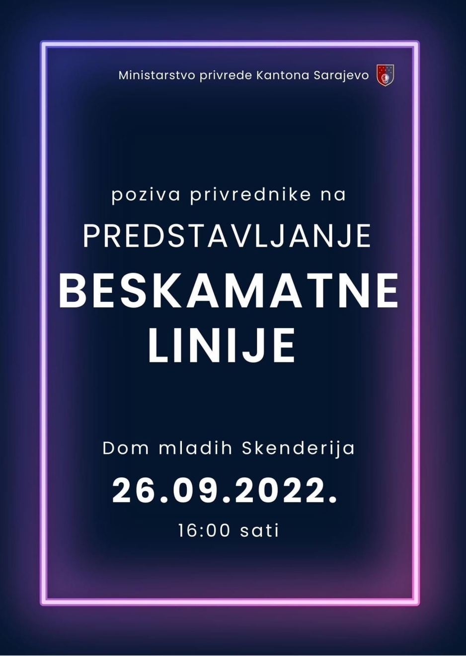 Ministarstvo privrede Kantona Sarajevo je, u okviru provođenja mjere pristupa izvorima povoljnijeg finansiranja male privrede, obezbijedilo beskamatnu kreditnu liniju čija će se promocija održati 26. septembra.
