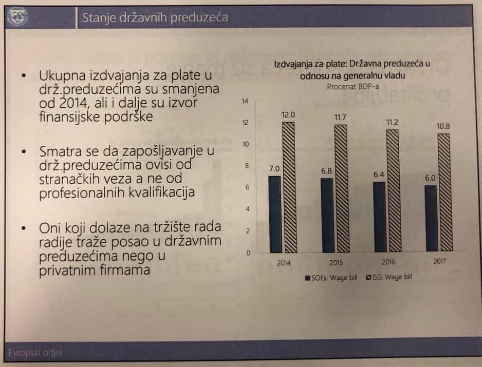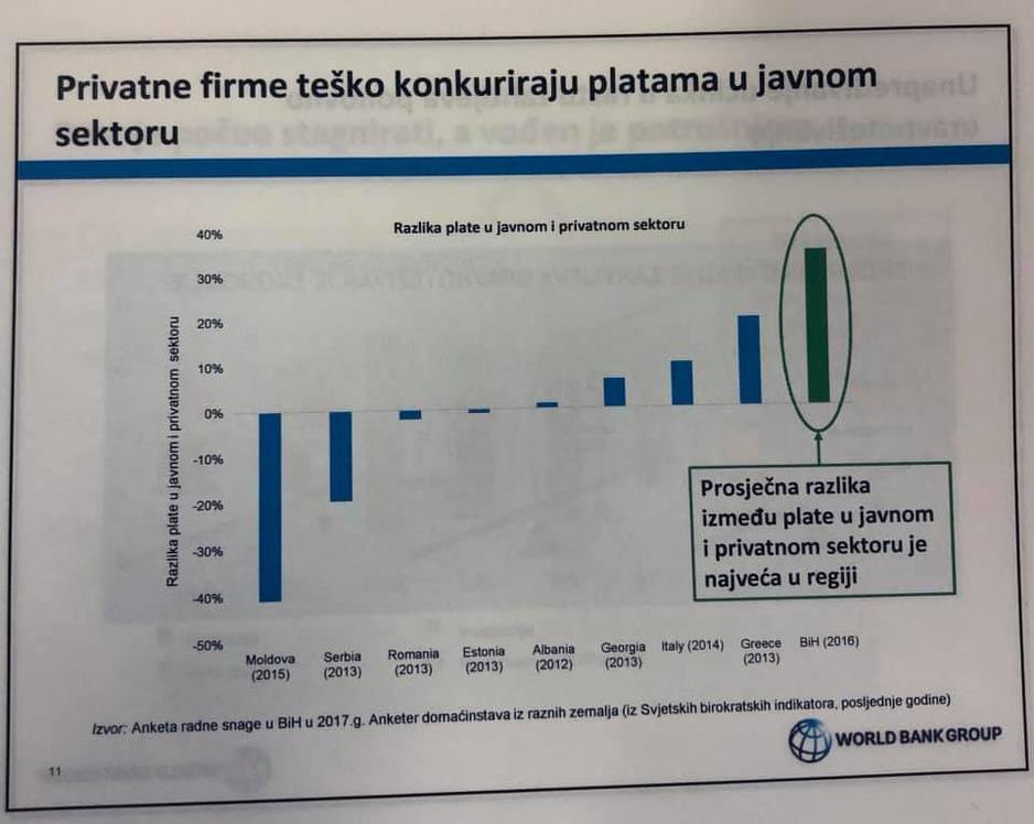 "Ukupna izdvajanja za plate u državnim preduzećima su smanjena od 2014. godine, ali i dalje su izvor finansijske podrške; smatra se da zapošljavanje u državnim preduzećima ovisi od stranačkih veza a ne od profesionalnih kvalifikacija; oni koji dolaze na tržište rada radije traže posao u državnim preduzećima nego u privatnim firmama", navodi se u izvještaju Svjetske banke.