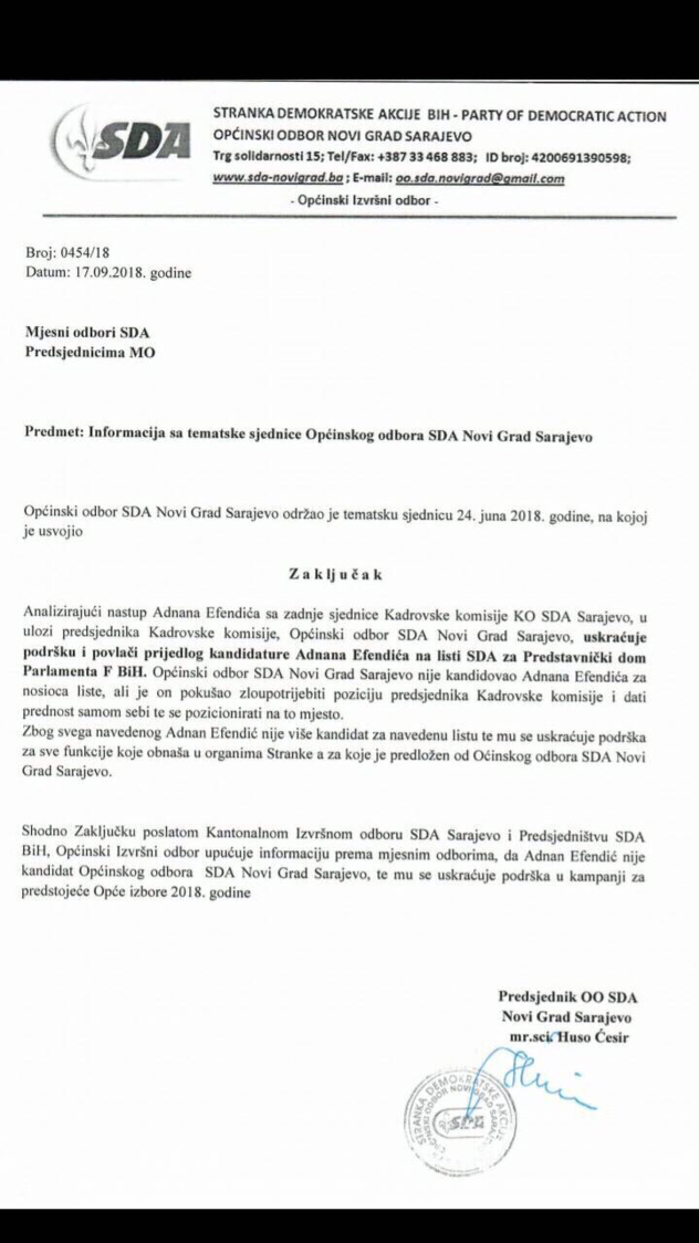''Analizirajući nastup Adnana Efendića sa zadnje sjednice Kadrovske komisije KO SDA Sarajevu te da OO povlači prijedlog kandidature Efendića na listi SDA za Predstavnički dom Parlamenta FBiH. Odbor nije kandidovao Adnana Efendića za nosioca liste ali je on pokušao zloupotrijebiti poziciju predsjednika Kadrovske komsijje i dati prednost samom sebi te se pozicionirati na tom mjestu. Zbog svega navedenog Adnan Efendić više nije kandidat za navedenu listu“, kaže se u zaključku.