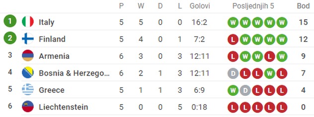 Armenija je današnjom pobjedom prestigla BiH i zauzela treće mjesto na tabeli s devet bodova. BiH je ostala na sedam bodova i bit će potrebno pravo čudo da se dostigne drugoplasirana Finska, koja trenutno drži mjesto koje vodi direktno na Euro. Italija je neprikosnovena na prvoj poziciji.