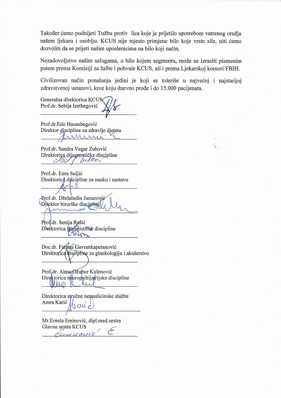 "Svojim govorom predsjedavajući Konaković jedan je od onih koji je doprinio napadu na dr.Edu Hasanbegovića i uposlenike Pedijatrijske klinike. Ljekari i osoblje KCUS nakon ovog događaja strahuju za vlastite živote, te je ozbiljno narušena radna atmosfera. S toga ćemo stupiti u dvosatni štrajk upozorenja, kako bismo digli svoj glas protiv hajke koja se kontinuirano provodi protiv ljekara KCUS. Upozoravamo huškače, ma ko da su oni, da KCUS nije mjesto za sticanje političkih poena ili lične koristi, te da ćemo se ozbiljno i zakonski obračunati sa onima koji udaraju na naše dostojanstvo i profesionalni integritet. Također ćemo podnijeti tužbu protiv lica koje je prijetilo upotrebom vatrenog oružja našem ljekaru i osoblju. KCUS nije mjesto primjene bilo koje vrste sile, niti ćemo dozvoliti da se prijeti našim uposlenicima na bilo koji način. Nezadovoljstvo našim uslugama, u bilo kojem segmentu, može se izraziti pismenim putem prema Komisiji za žalbe i pohvale KCUS, ali i prema Ljekarskoj komori FBiH. Civilizovan način ponašanja jedini je koji se toleriše u najvećoj i najstarijoj zdravstvenoj ustanovi, kroz koju dnevno prođe i do 15.000 pacijenata", zaključuje se u saopćenju.