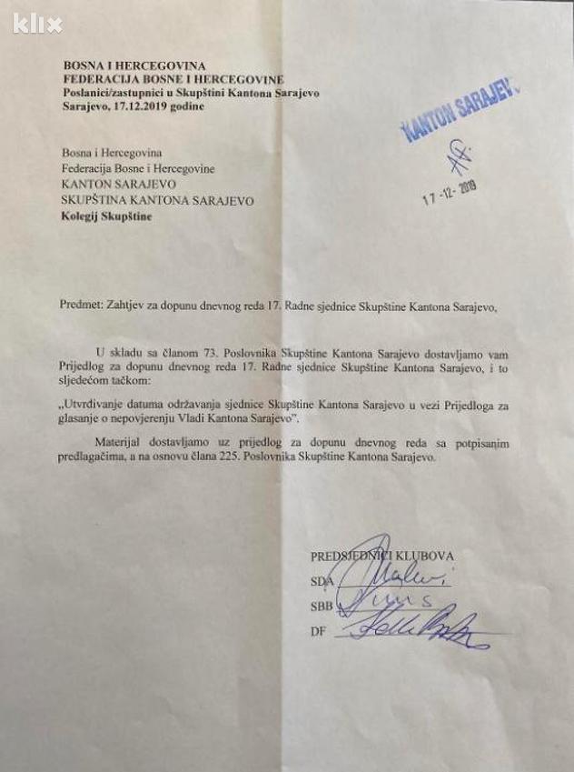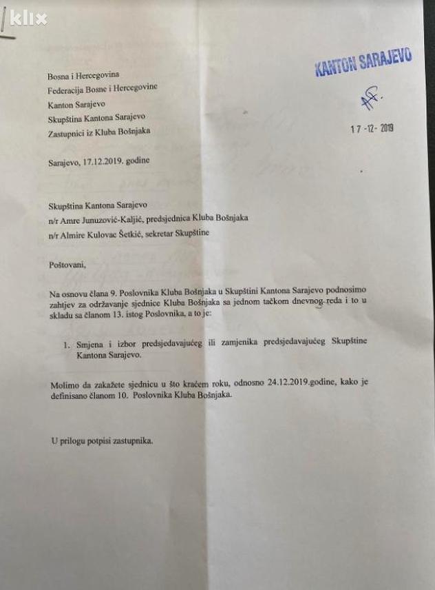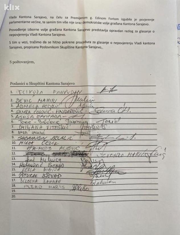 Zahtjev je potpisalo 18 zastupnika u Skupštini KS s tim što nedostaje potpis zastupnice Jasne Duraković iz SBB-a, koja trenutno boravi u Sjedinjenim Američkim Državama, i samo fizički nije u prilici da stavi svoj potpis na zahtjev.