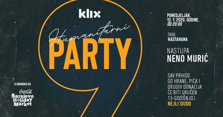 Tradicionalni 9. humanitarni party portala Klix.ba bit će održan u ponedjeljak, 13. januara na Sarajevo Holiday Marketu. Za dobru zabavu pobrinut će se pjevač Neno Murić, a sav prihod bit će doniran za liječenje djevojčice Nejle Dudo.