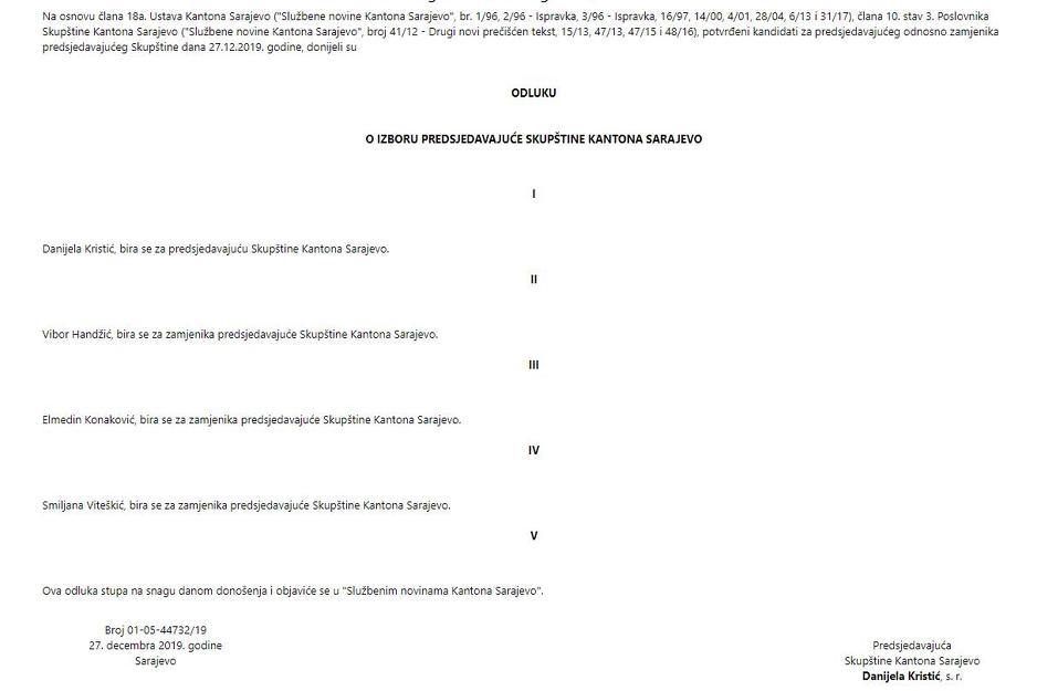 Službeno objavljeno: Danijela Kristić je predsjedavajuća Skupštine Kantona Sarajevo