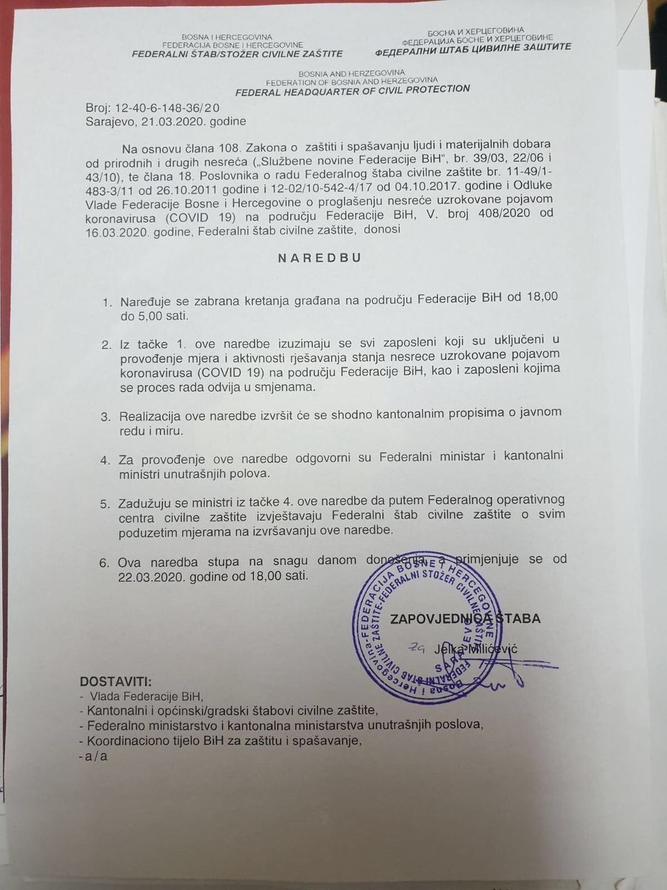 Federalni štab donio naredbu: Od sutra navečer zabrana kretanja od 18 do 5 sati
