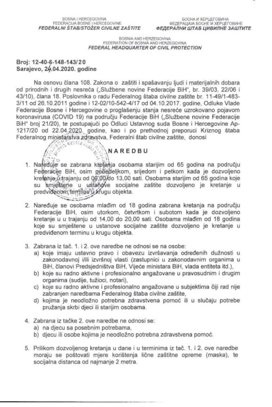 Utorkom, četvrtkom i subotom, odluka je Federalnog štaba, dozvoljeno je kretanje za mlađe od 18 godina i to od 14 sati pa sve do 20 sati.