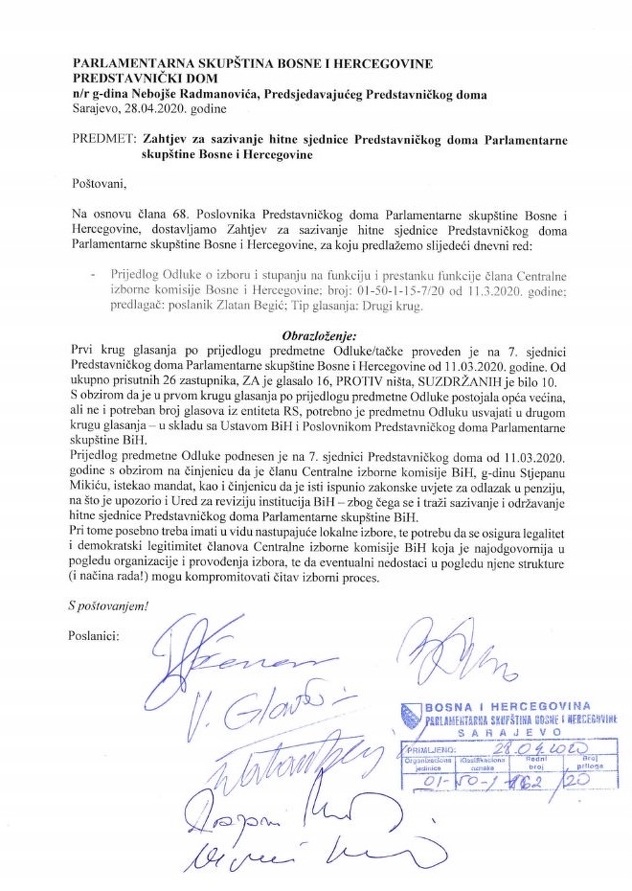 Budući da nije bilo potrebne entitetske većine iz RS-a, odluku treba usvojiti u drugom krugu glasanja. Kako se navodi u zahtjevu, budući da je prethodnom članu CIK-a Stejpanu Mikiću istekao mandat i zbog toga što je ispunio uvjete za penziju, potrebno je sazvati hitnu sjednicu ovog doma.