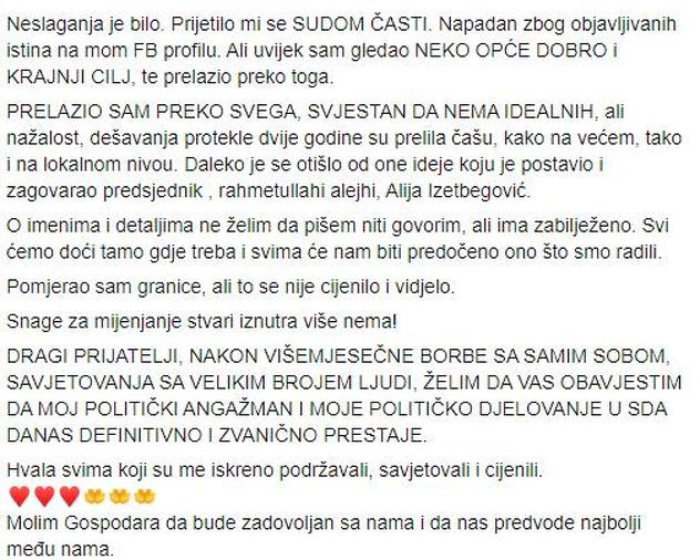 Naglasio je da ne želi govoriti o imenima i detaljima, obznanivši da njegov politički angažman i političko djelovanje u SDA danas definitivno i zvanično prestaje.