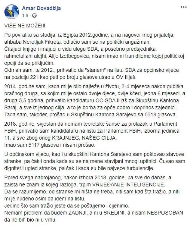 "U skupštini Kantona Sarajevo sam poštovao stavove stranke, pa čak i onda kada su se na mene stavljani mnogi upitnici. Čuvao sam dignitet i ugled stranke, pa čak i kada su bile najveće turbulencije", napisao je Dovadžija.