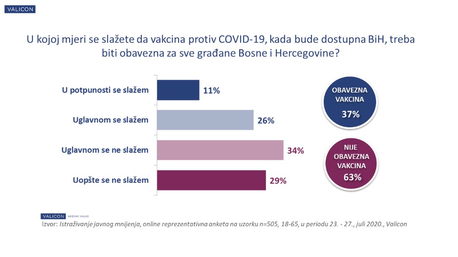 Širenjem pandemije, sa sve većim porastom broja zaraženih virusom COVID-19, te sa sve većim udjelom mlade i zrele populacije koji obolijevaju, u svijetu se s velikim interesovanjem i očekivanjima prate i informacije o testiranjima i mogućnostima pronalaska učinkovite vakcine. Osim izazova pronalaska učinkovite vakcine postoji i izazov prihvaćanja vakcine od javnosti, ali i pitanje koje se nalazi pred vladajućim institucijama – hoće li vakcinacija biti obavezna za sve građane. Stoga, kompanija Valicon je htjela ispitati stavove bh. populacije u vezi s potencijalnom vakcinom protiv COVID-19.