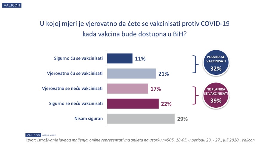 Za vakcinisanje je 32% bh. populacije, a protiv 39%, dok je ostatak populacije neudlučan i nema jasan stav kada je riječ o namjeri eventualne vakcinacije protiv COVID-19.