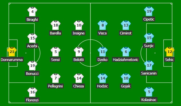 U startnoj postavi Italije su Donnarumma, Florenzi, Bonucci, Acerbi, Biraghi, Pellegrini, Sensi, Barella, Chiesa, Belotti i Insigne.