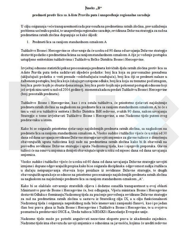 Između ostalog, Tužilaštvo BiH se obavezuje da će u roku od 90 dana od usvajanja Državne strategije dostaviti podatke o predmetima/osobama s ranijom standardnom oznakom A, čije je vođenje postupka ustupljeno entitetskim tužilaštvima i Tužilaštvu Brčko distrikta BiH.