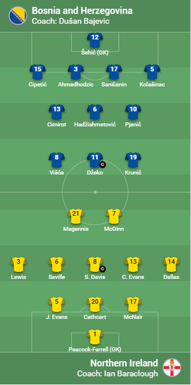 Selektor Sjeverne Irske Ian Baraclough se odlučio za sastav: Peacock-Farrell, J. Evans, Cathcart, McNair, Lewis, Seville, S. Davis, C. Evans, Dallas, Magennis i McGinn.