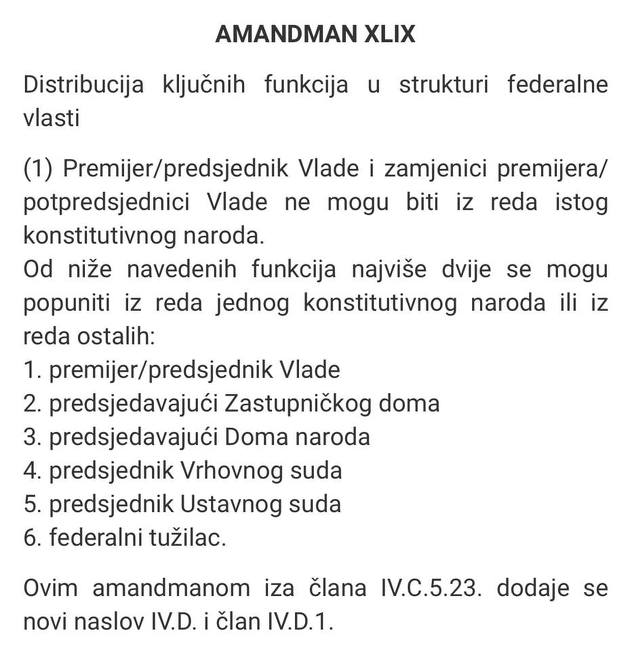U praksi to izgleda ovako: Premijer Fadil Novalić i predsjedavajući Zastupničkog doma Mirsad Zaimović su iz reda bošnjačkog, dok su predsjedavajući Doma naroda Tomislav Martinović i predsjednica Ustavnog suda Kata Senjak iz reda hrvatskog naroda.