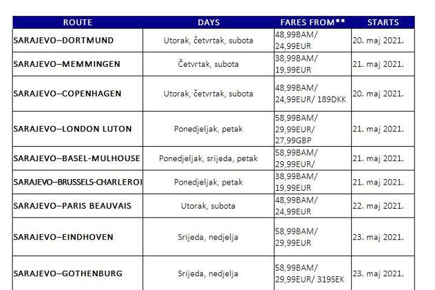 Osim uspostavljanja nove baze, Wizz Air je od maja 2021. najavio i pokretanje devet novih ruta iz Sarajeva ka gradovima u sedam zemalja. Mjesta na novim letovima već se mogu rezervisati na wizzair.com ili putem mobilne aplikacije aviokompanije po cijeni već od 38,99 BAM/19,99 eura.