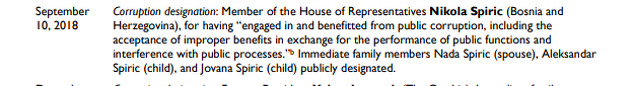 Interesantno, bugarski zvaničnici koji su sankcionirani na osnovu ovog zakona, tačnije odjeljka 7031 Zakona o aproprijacijama State Departmenta, sada će se naći na spisku i s bh. političarima poput Nikole Špirića, koji se od 2018. godine nalazi na ovoj listi.