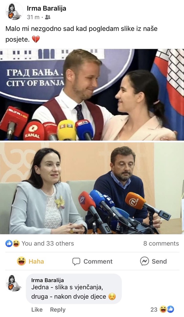 Jučerašnje dešavanje u Banjoj Luci potpredsjednica Naše stranke prokomentarisala je fotografijom Benjamine Karić u posjeti Mostaru, na kojoj se nalazi s gradonačelnikom Kordićem, i fotografijom s gradonačelnikom Banje Luke. Baralija je napisala kako joj je malo nezgodno sada kad pogleda slike iz posjete. U komentaru ispod fotografije Baralija je navela poređenje kako je Benjaminina fotografija sa Stanivukovićem kao fotografija s vjenčanja, dok je pak njena fotografija s Kordićem kao ona nakon dvoje djece.