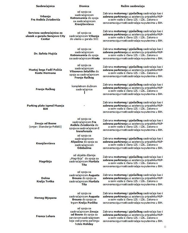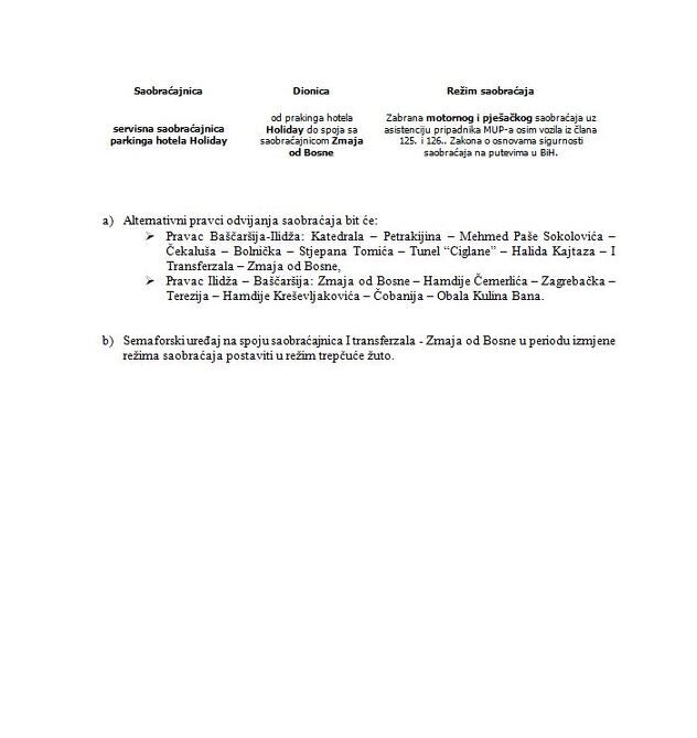 Izmjena režima saobraćaja u periodu od 7:00 do 14:00 sati na trasi kojom će se kretati učesnici povorke: Park Safeta Isovića - ulica Koševo - ulica Maršala Tita - Trg Bosne i Hercegovine - zgrada Parlamenta BiH.
