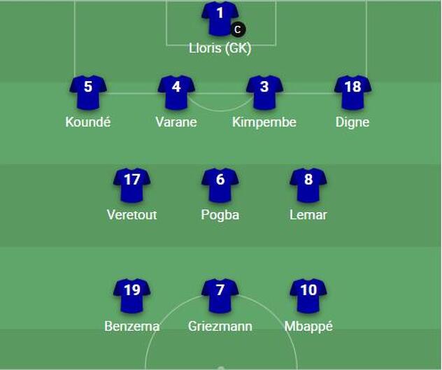 U veznom redu su Jordan Veretout, Paul Pogba i Thomas Lemar, dok napadački trio čine Antoine Griezmann, Karim Benzema i Kylian Mbappe.