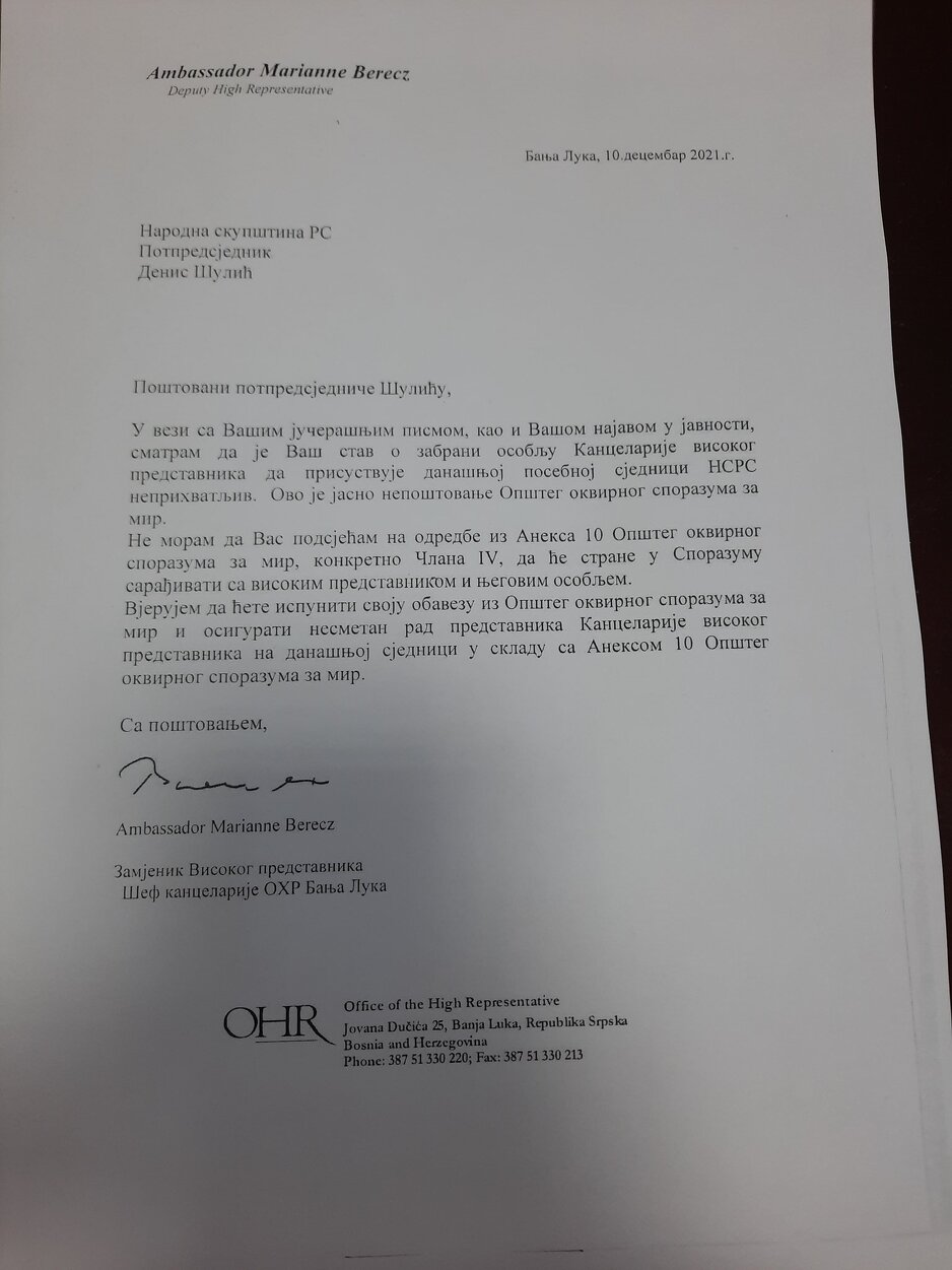 "Ovo je jasno nepoštovanje Dejtonskog sporazuma. Vjerujem da ćete ispoštovati svoju obavezu iz Dejtonskog sporazuma i osigurati nesmetan rad predstavnika OHR-a na današnjoj sjednici u skladu s Aneksom 10 Dejtonskog sporazuma", stoji u pismu Berecz.