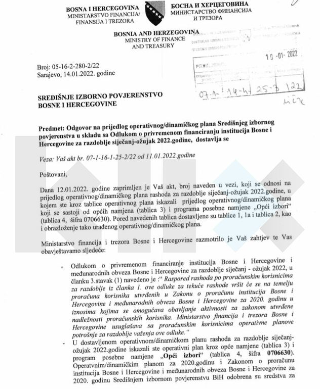 "CIK postupa po uputstvu, odvaja Operativni plan, a dodatno priprema odluku na osnovu člana 11 stav 5 kako ih je uputio ministar Vjekoslav Bevanda i zahtjevaju da se osiguraju sredstva u prvobitnom iznosu od 11,7 miliona KM, a kasnije su tražili još 800 hiljada zbog poskupljenja i inflacije. Šalju to Ministarstvu finansija i trezora i Uredu za zakonodavstvo, provode javne konsultacije. 24. marta Ministarstvo finansija ponovo daje negativno mišljenje. To je u suprotnosti sa odgovorom od 14. januara koje su dali CIK-u i gdje su ih uputili na član 11 stav 5", ističe Rančić.