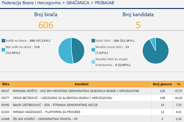 Kako se može vidjeti na stranici CIK-a, na biračkom mjestu 133A026, Švrakino Selo II/2, Borjana Krišto je osvojila 128 glasova, tj. 41,83 posto.