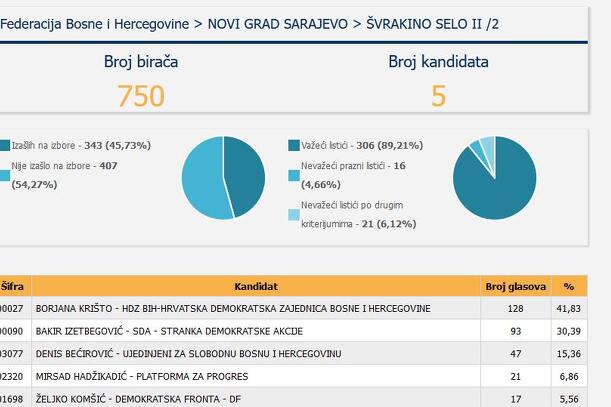 Zanimljivost tokom jučerašnjeg glasanja desila se u naselju Švrakino Selo u Sarajevu na biračkom mjestu u Osnovnoj školi Džemaludin Čaušević, gdje je HDZ-ova kandidatkinja za Predsjedništvo BiH Borjana Krišto upisala najveći broj glasova.