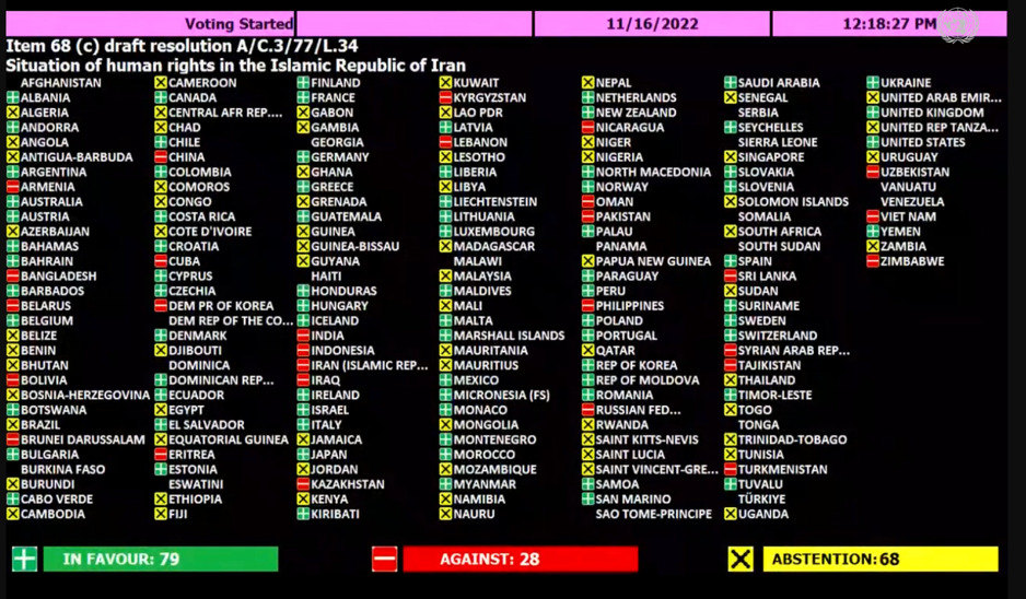 Zbog situacije u Iranu i protesta koji se održavaju u ovoj državi već nekoliko sedmica, komitet Ujedinjenih nacija razmatrao je nacrt rezolucije pod nazivom "Stanje ljudskih prava u Islamskoj Republici Iran".