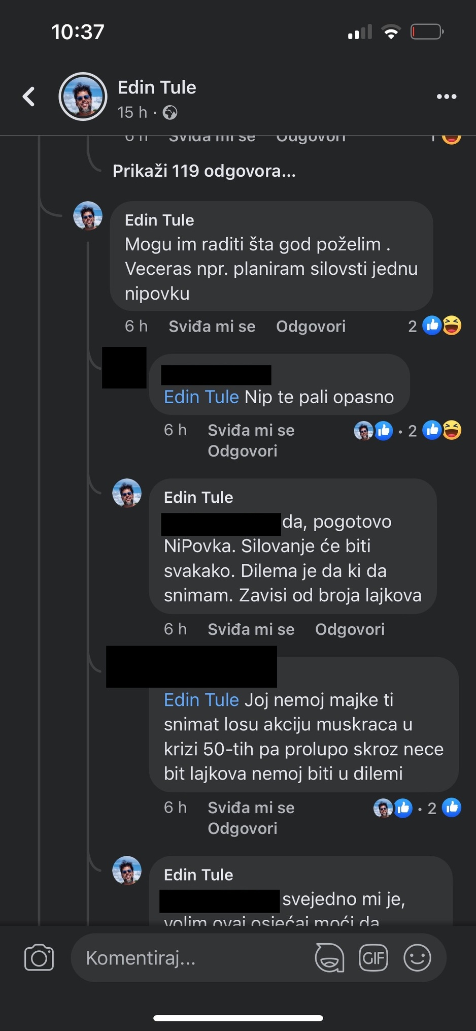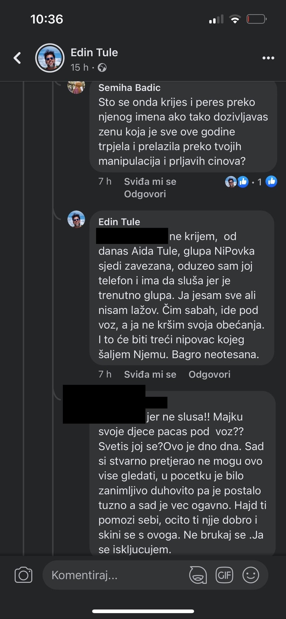 Na društvenim mrežama, Tule je objavio uznemirujuće videomaterijale u kojima ne samo da prijeti svojoj supruzi Aidi, nego je i izrazio prijetnje političarima i drugim osobama. Tule tvrdi da drži suprugu vezanu i da je namjerava silovati i baciti pod voz.