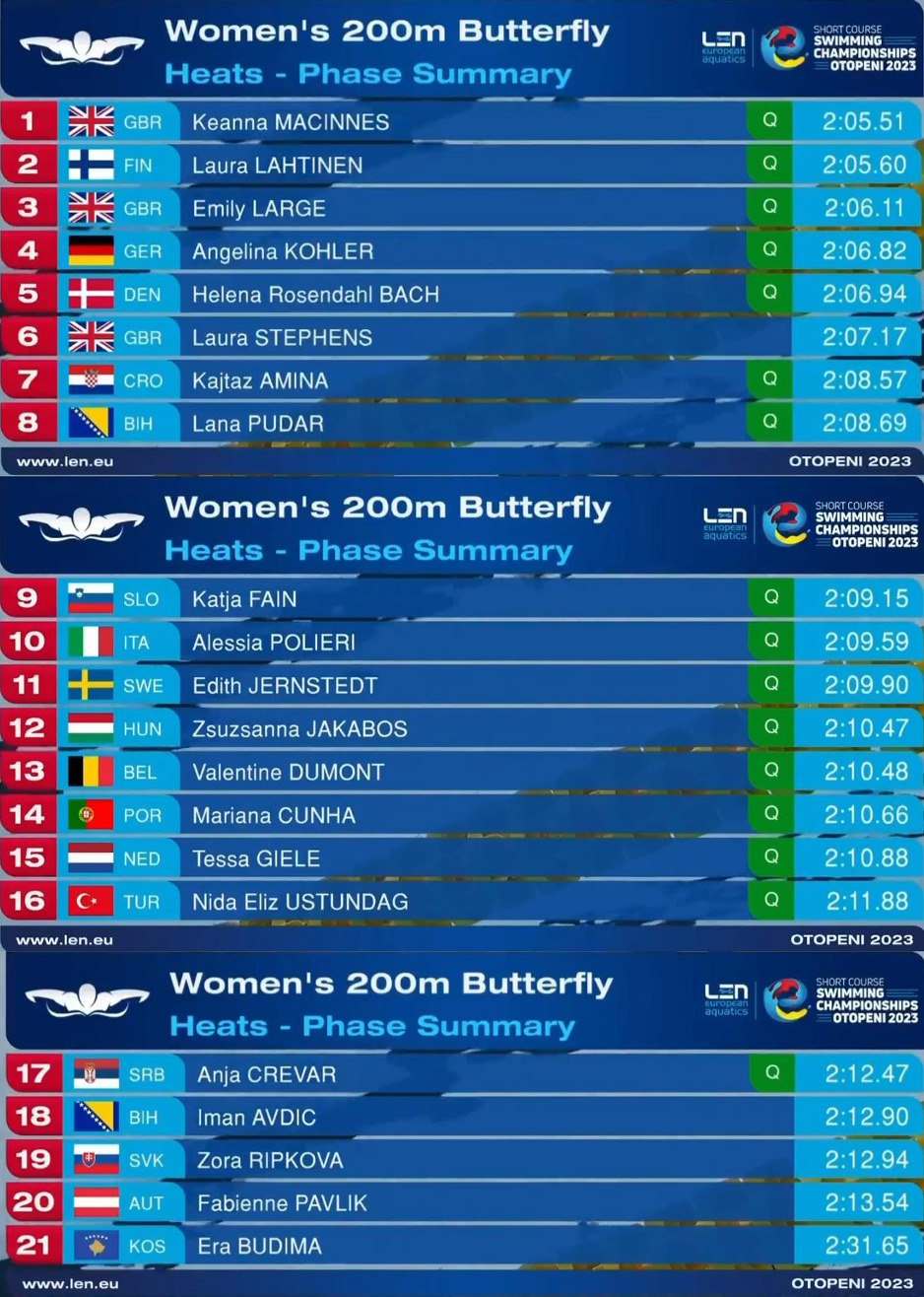 Lana je 200 metara isplivala s vremenom 2:08:69, a ispred nje su u kvalifikacionoj grupi bile Keanna Maxinnes, Angelina Kohler i Amina Kajtaz.