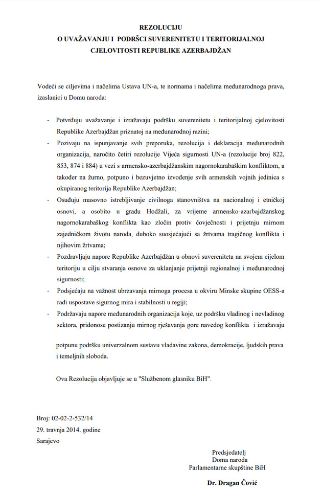 Treba istaći kako je Bosna i Hercegovina podržala Azerbejdžan 2014. godine kada je Parlamentu Bosne i Hercegovine usvojena rezolucija "O uvažavanju i podršci suverenitetu i teritorijalnoj cjelovitosti Republike Azerbejdžan".