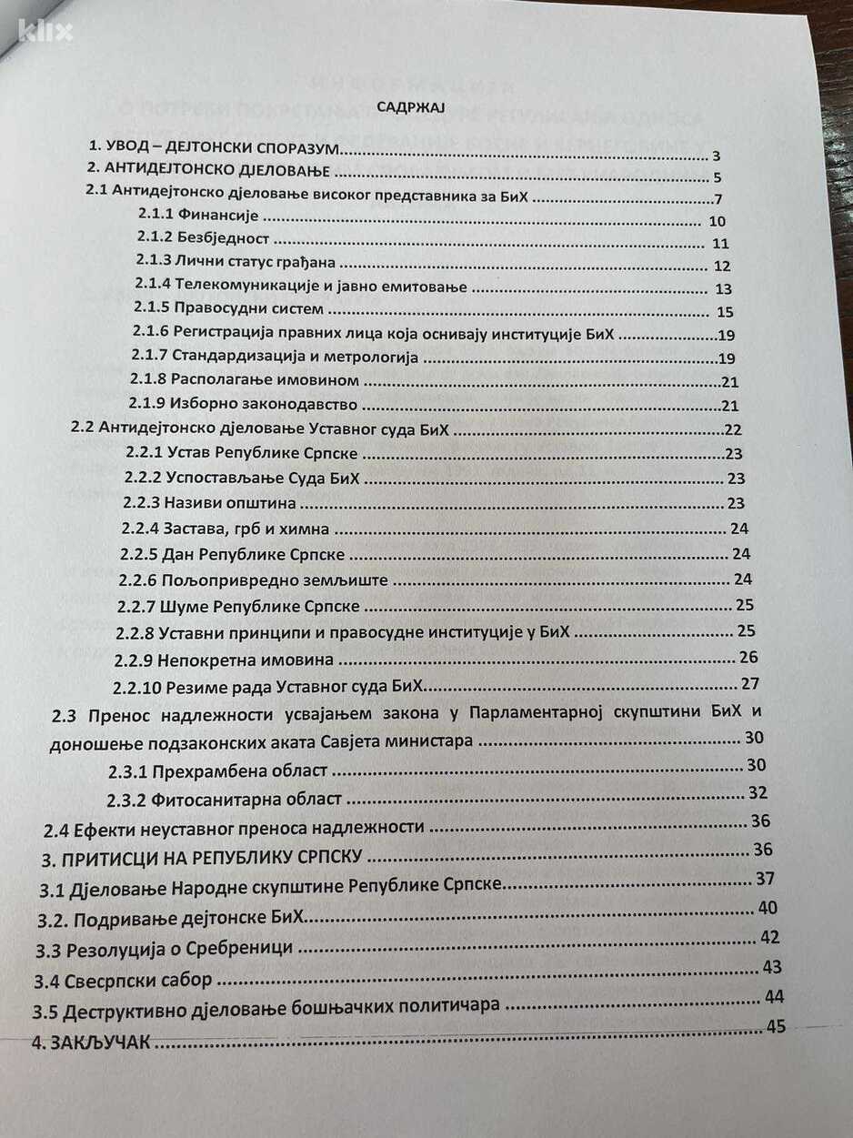 Taj dokument sadrži 45 strana i definiše kakvo je to antidejtonsko djelovanje do sada bilo prisutno u BiH, odnosno, kako su navodno visoki predstavnik i Ustavni sud BiH pojedinačno djelovali antidejtonski. Sadrži i informaciju o prenosu nadležnosti kroz godine, kao i efekte tog prenosa nadležnosti. Jedan dio Informacije se odnosi na "pritiske na RS", ali i rezoluciju o genocidu u Srebrenici, svesrpski sabor, "destruktivno djelovanje bošnjačkih političara", "podrivanje dejtonske BiH" i drugo.