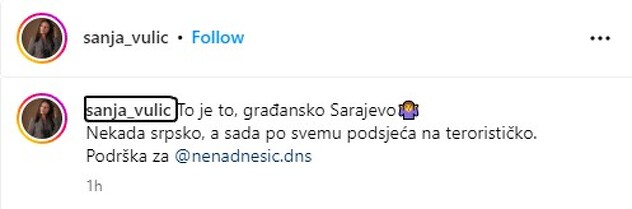 "To je to građansko Sarajevo, nekada srpsko, a sada po svemu sudeći terorističko", napisala je Vulić na Instagramu.