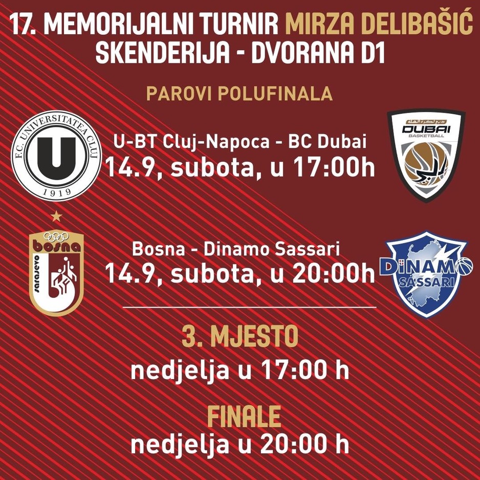 Polufinalne utakmice igraju se u subotu: od 17h na rasporedu je susret BC Dubai - U-BT Cluj Napoca, a od 20 h KK Bosna - Dinamo BDS Sassari. U nedjelju se igraju utakmica za 3. mjesto te finalna utakmica.