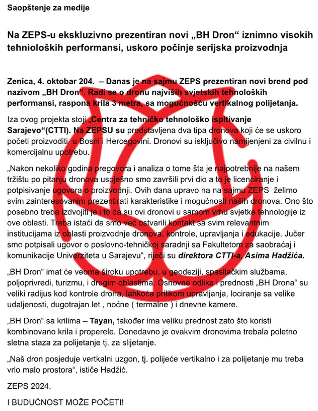 Kontaktirali smo i Asima Hadžića, direktora Centar za tehničko tehnološko ispitivanje Sarajevo, koji nam je objasnio kako je došlo do greške u predstavljanju drona.