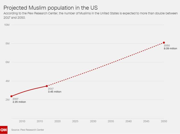 Pew Centar koji je radio istraživanje i 2007. te 2011. godine predviđao je da će muslimanska populacija u SAD-u ubrzano rasti te da će od previđenih 3,45 miliona u 2017. do 2050. godine taj broj biti više nego udvostručen te da će narasti do 8,1 miliona.