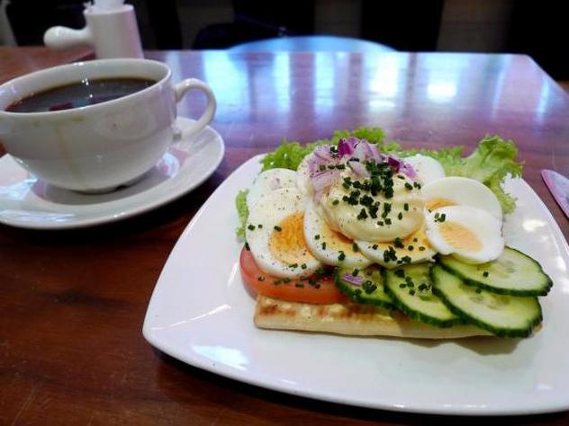 Otvoreni sendvič sa ribom, hladnim jajima, sirom ,majonezom i povrćem poput krastavica i paradajza.