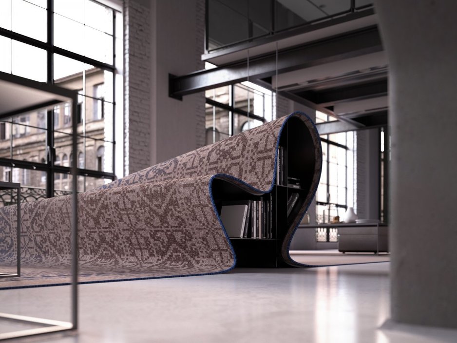Ovaj tepih osmišljen je tako da ima strukturu koja omogućava sjedenje, zahvaljujući svojoj jezgri, a ima i odgovarajuću postavu pa je udobna korisnicima. Ugrađene police služe za držanje knjiga ili časopisa, a sav nered ostaje skriven ispod nabora.